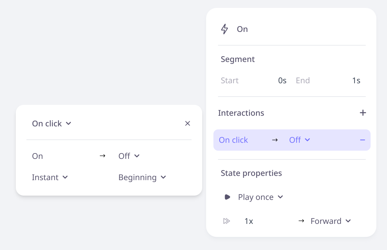 <figure><img src="https://1768268082-files.gitbook.io/~/files/v0/b/gitbook-x-prod.appspot.com/o/spaces%2FhgGiOKJySIZ4fBeXk0CD%2Fuploads%2FnsHMLc2dAA8VrtR5BGpR%2Fimage.png?alt=media&#x26;token=0093497f-1a55-4597-85c0-531f2518f451" alt="" width="563"><figcaption><p>A single On Click interaction that tells the Lottie to switch from state On to state Off.</p></figcaption></figure>