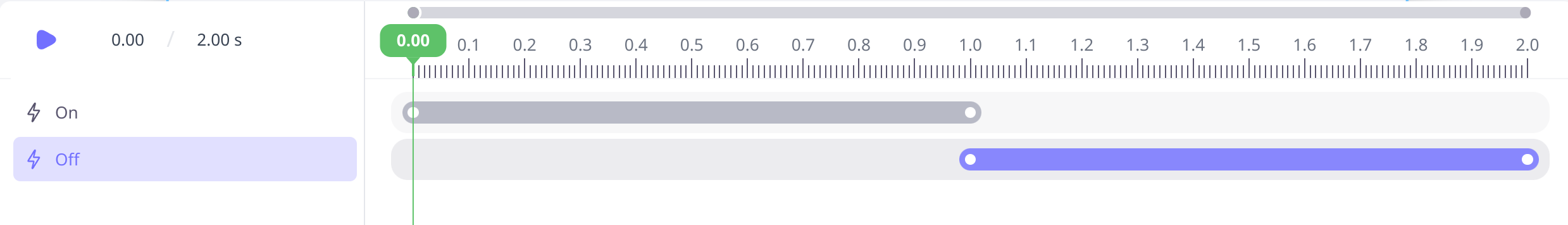 For example, you can create a light switch animation that switches on from beginning until time 1.0s, and then switches off from time 1.0s until the end. Then, you can start *adding interactive behavior* to this light switch by making these two segments correspond to your "On" and "Off" states, like in the picture below: